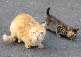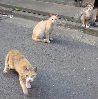 | 運動会の前日に、筋肉痛の中自転車でちょっと遠くまで行った時に出会った野良猫達たち。 野良たちに会うと、ついつい餌を上げたくなってしまう…。 |